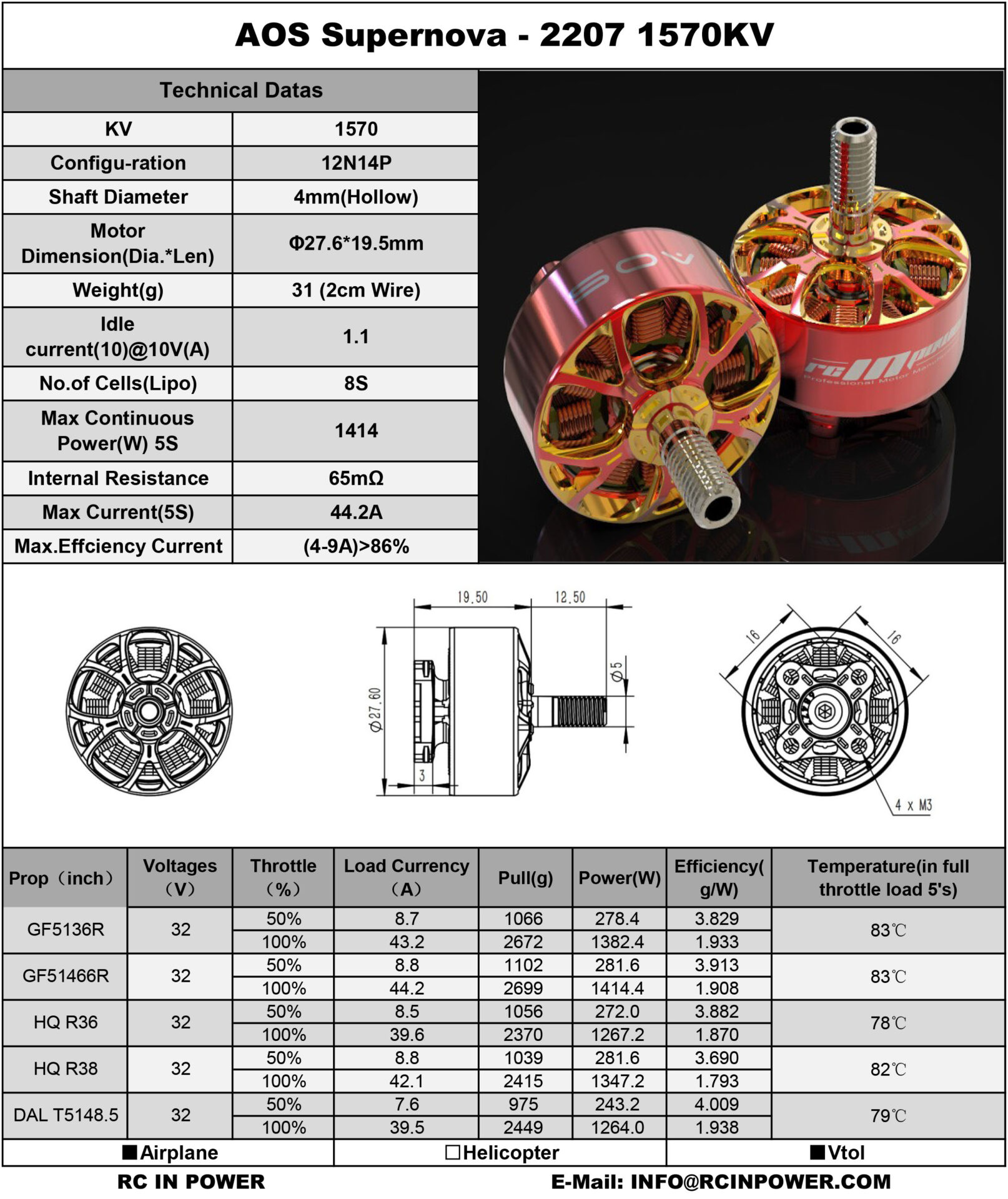 AOS Supernova 2207 1570KV je špičkový FPV motor navržený ve spolupráci mezi Chrisem Rosserem a RCinPower, optimalizovaný pro 8S baterie a vysoký výkon při zachování efektivity. Nabízí o 38 % vyšší tah, přes 50% nárůst točivého momentu a výrazně rychlejší odezvu otáček oproti běžným 6S motorům. S účinností přes 86 % při typickém zatížení a kvalitním zpracováním (ložiska z Japonska, magnety N52H, vinutí s tepelnou odolností do 260 °C) je ideální pro freestyle i závodní drony.