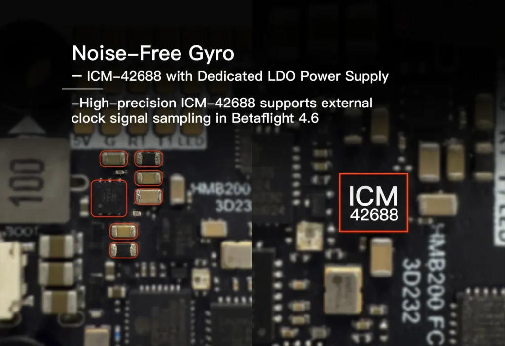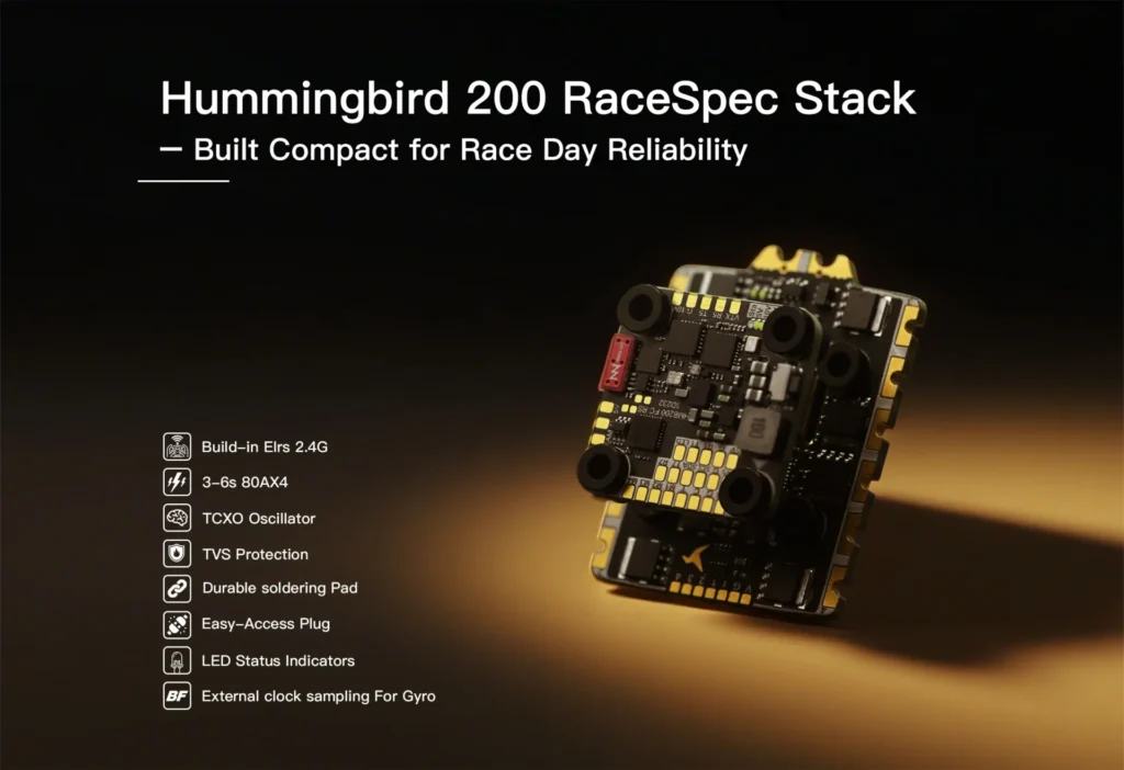 Hummingbird 200 RaceSpec Stack je kompletní jednotka určená pro výkonné 5-inch FPV drony. Flight controller běží na procesoru AT32F435 s vysokou frekvencí 288 MHz, což poskytuje dostatek výpočetního výkonu pro plynulé a rychlé zpracování gyra, OSD, telemetrie a signálu z přijímače. Gyro je ICM-42688 s dedikovaným LDO napájením, což zlepšuje stabilitu dat a snižuje šum.