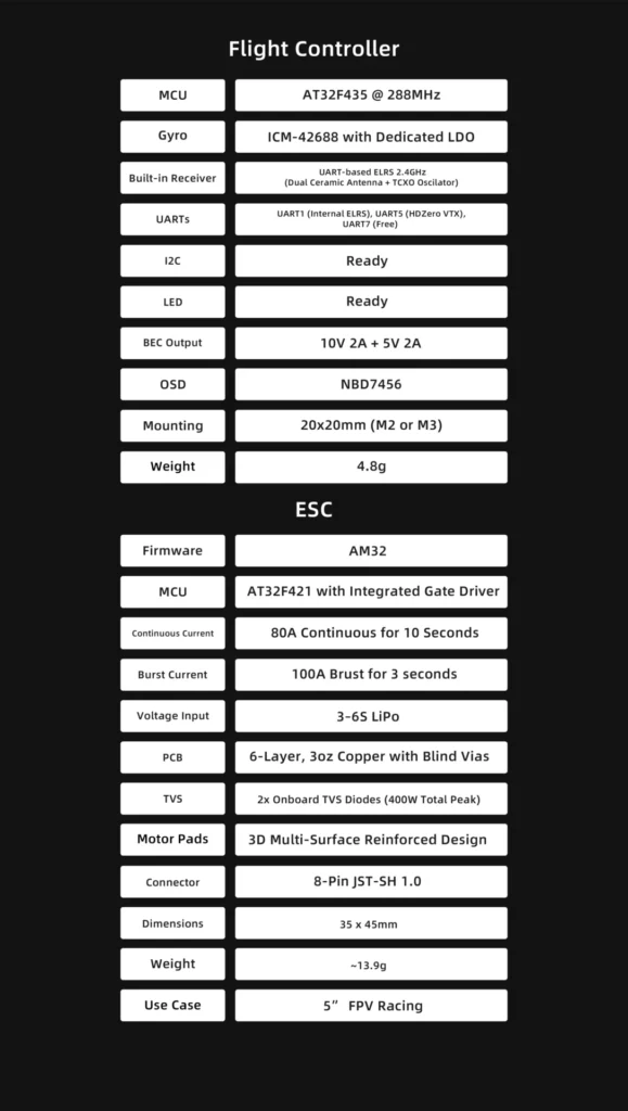 Stack podporuje napájení od 3S do 6S LiPo/LiHV — což umožňuje nasadit silnější motory a vrtule, a dosáhnout vyššího tahu a rychlosti, než u 1S nebo 2S sestav. To dělá z tohoto stacku vhodnou volbu pro 5″ závodní drony, freestyle buildy nebo FPV drony s náročnějšími nároky na výkon.
