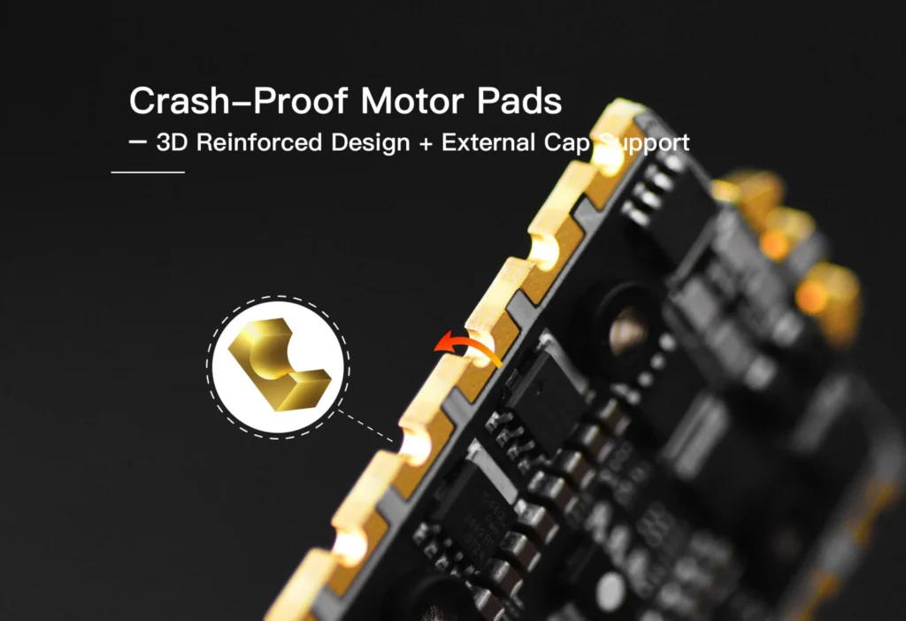 ESC je navržen pro náročné závodní i freestyle podmínky. S 80 A kontinuálním a 100 A burst proudem dokáže udržet vysoké otáčky motorů i při silné zátěži, např. při akceleraci nebo prudkých manévrech. Konstrukce ESC s 6-vrstvou deskou a zlacenými spoji zajišťuje dobré rozptýlení tepla a odolnost proti přehřátí, blind-vias a TVS diody chrání elektroniku před napěťovými špičkami. 3D pad konstrukce motorových vývodů (možnost pájení zeshora, zespodu i ze strany) zvyšuje mechanickou odolnost — motorové vodiče tak vydrží opakované nárazy a pády bez rizika utržení padů.